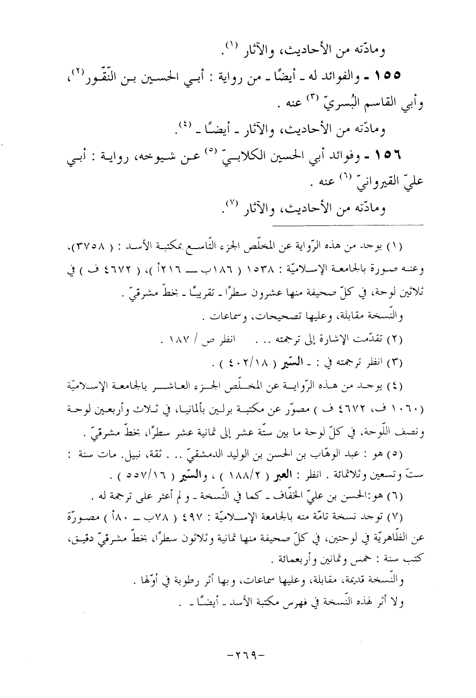 155- والفوائد له أيضًا من رواية: أبي الحسين بن النّقّور (¬2) ، وأبي القاسم البُسريّ (¬3) عنه. ومادّته من الأحاديث، والآثار أيضا (¬4) .