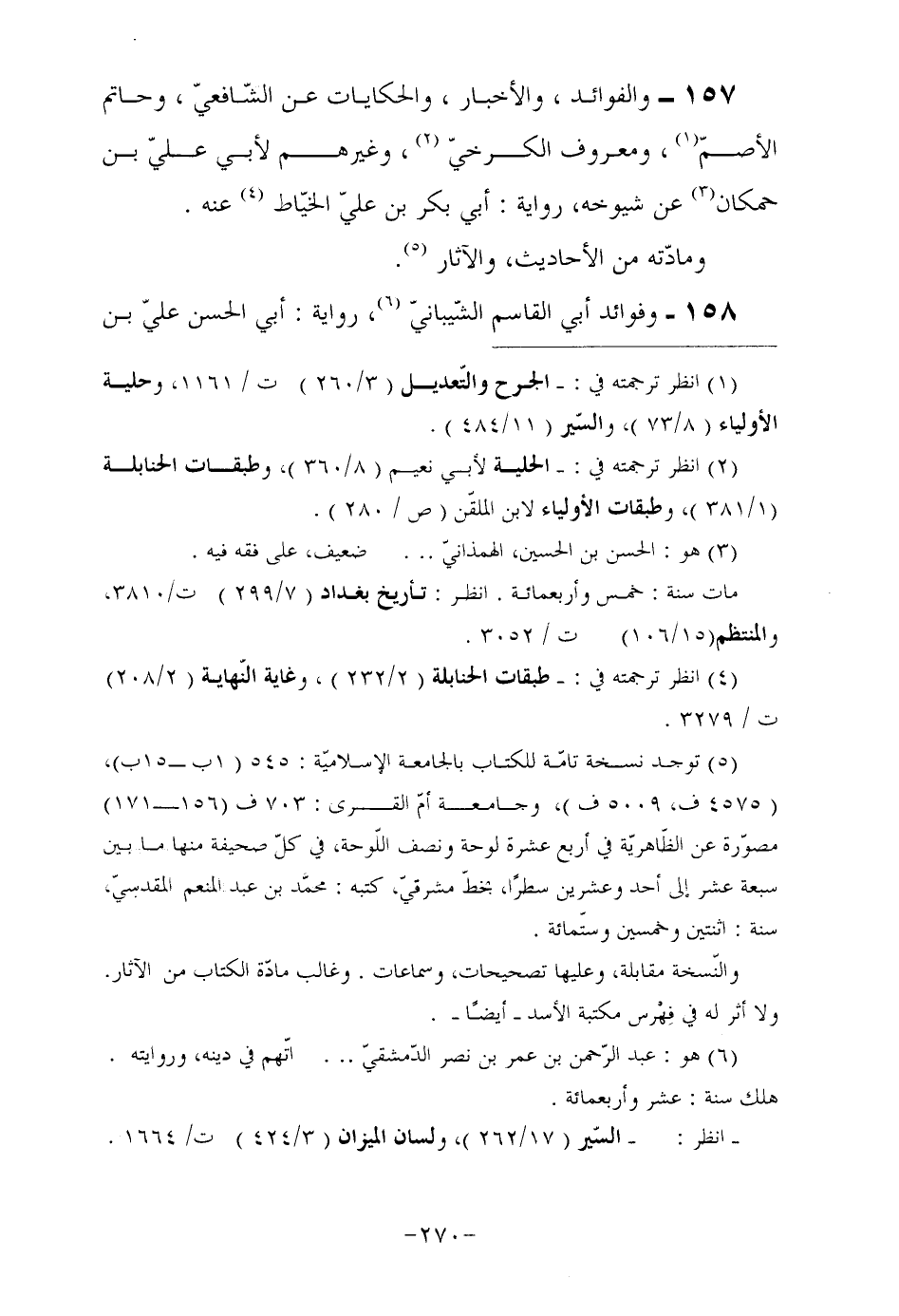 (¬5) توجد نسخة تامّة للكتاب بالجامعة الإسلاميّة: 545 (1ب-15ب) ، (4575 ف، 5009 ف) ، وجامعة أمّ القرى: 703 ف (156171) مصوّرة عن الظّاهريّة في أربع عشرة لوحة ونصف اللّوحة، في كلّ صحيفة منها ما بين سبعة عشر إلى أحد وعشرين سطرًا، بخطّ مشرقيّ، كتبه: محمَّد بن عبد المنعم المقدسيّ، سنة: اثنتين وخمسين وستّمائة.