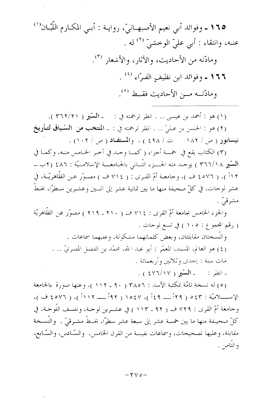 165- وفوائد أبي نعيم الأصبهانيّ، رواية: أبي المكارم اللّبّان (¬1) عنه، وانتقاء: أبي عليّ الوخشيّ (¬2) له. ومادّته من الأحاديث، والآثار، والأشعار (¬3) .