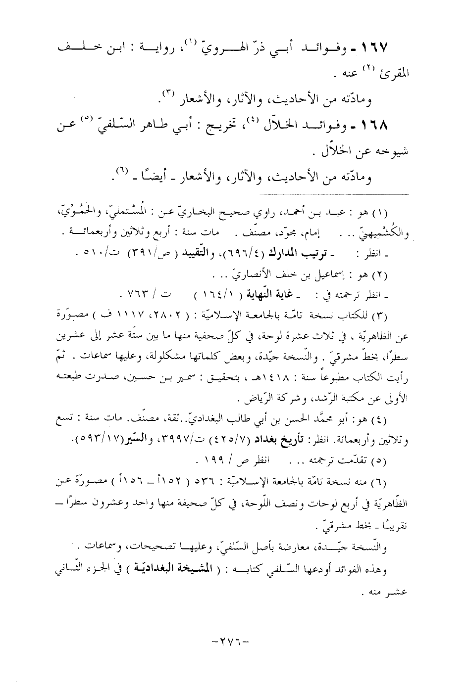 168- وفوائد الخلاّل (¬4) ، تخريج: أبي طاهر السّلفيّ (¬5) عن شيوخه عن الخلاّل. ومادّته من الأحاديث، والآثار، والأشعار أيضا (¬6) .