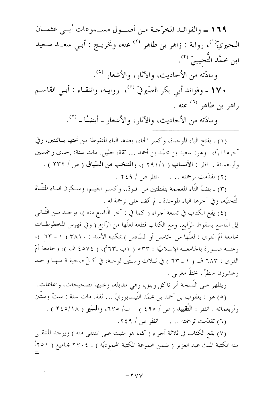 169- والفوائد المخرّجة من أصول مسموعات أبي عثمان البحيريّ (¬1) ، رواية: زاهر بن طاهر (¬2) عنه، وتخريج: أبي سعد سعيد ابن محمَّد التُّجِيبيّ (¬3) . ومادّته من الأحاديث، والآثار، والأشعار (¬4) .