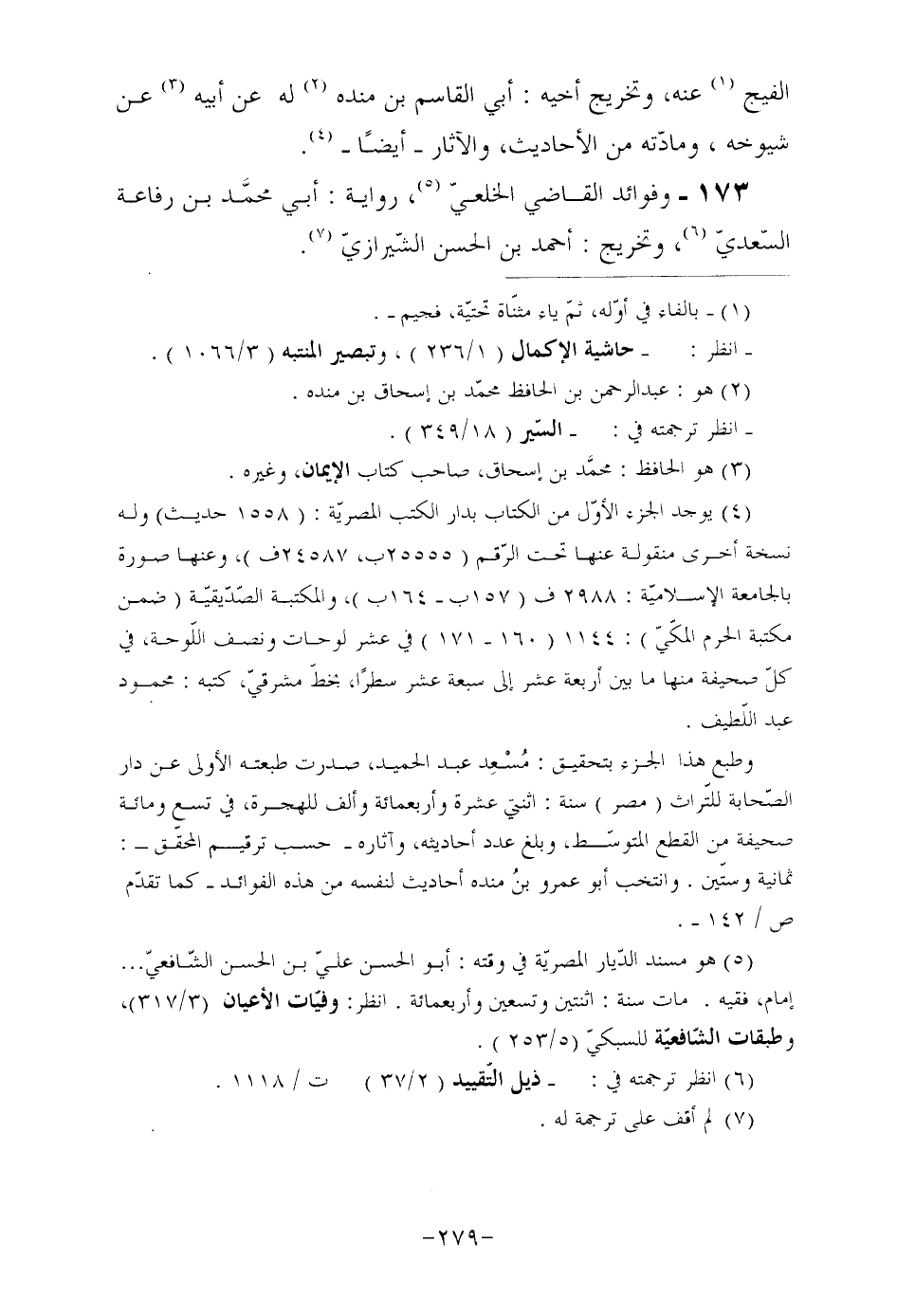 173- وفوائد القاضي الخلعيّ (¬5) ، رواية: أبي محمَّد بن رفاعة السّعديّ (¬6) ، وتخريج: أحمد بن الحسن الشّيرازيّ (¬7) .