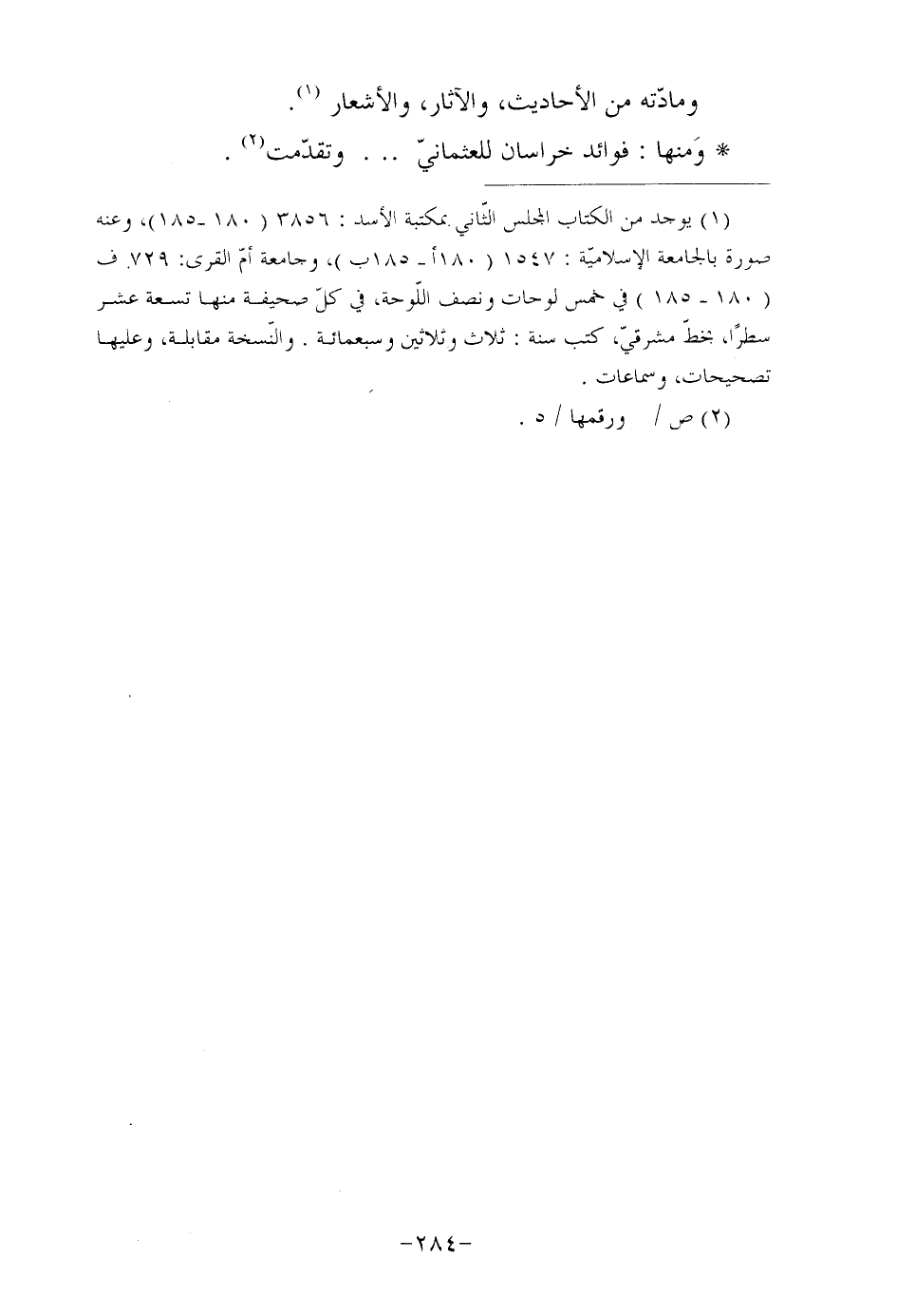 (¬1) يوجد من الكتاب المجلس الثّاني بمكتبة الأسد: 3856 (180-185) ، وعنه صورة بالجامعة الإسلاميّة: 1547 (180أ- 185ب) ، وجامعة أمّ القرى: 729 ف (180- 185) في خمس لوحات ونصف اللّوحة، في كلّ صحيفة منها تسعة عشر سطرًا، بخطّ مشرقيّ، كتب سنة: ثلاث وثلاثين وسبعمائة. والنّسخة مقابلة، وعليها تصحيحات، وسماعات.