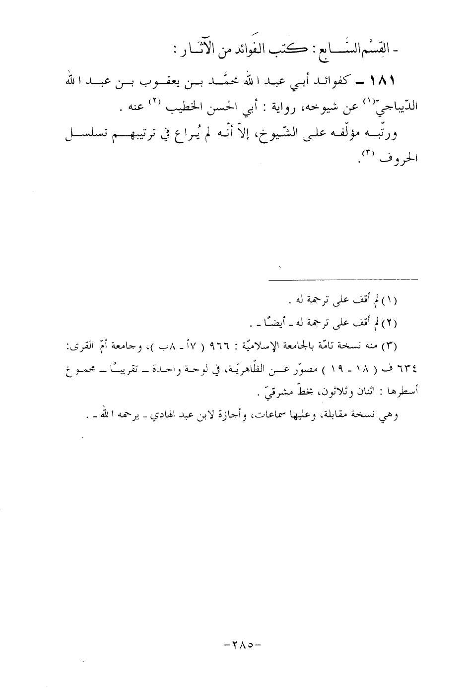 181- كفوائد أبي عبد الله محمَّد بن يعقوب بن عبد الله الدّيباجيّ (¬1) عن شيوخه، رواية: أبي الحسن الخطيب (¬2) عنه. ورتّبه مؤلّفه على الشّيوخ، إلاّ أنّه لم يُراع في ترتيبهم تسلسل الحروف (¬3) .