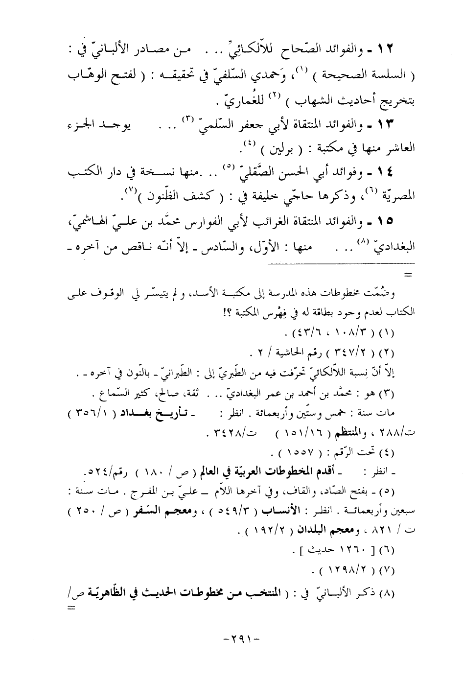 12- والفوائد الصّحاح للاّلكائِيِّ ... من مصادر الألبانيّ في: (السلسة الصحيحة) (¬1) ، وَحمدي السّلفيّ في تحقيقه: (لفتح الوهّاب بتخريج أحاديث الشهاب) (¬2) للغُماريّ.