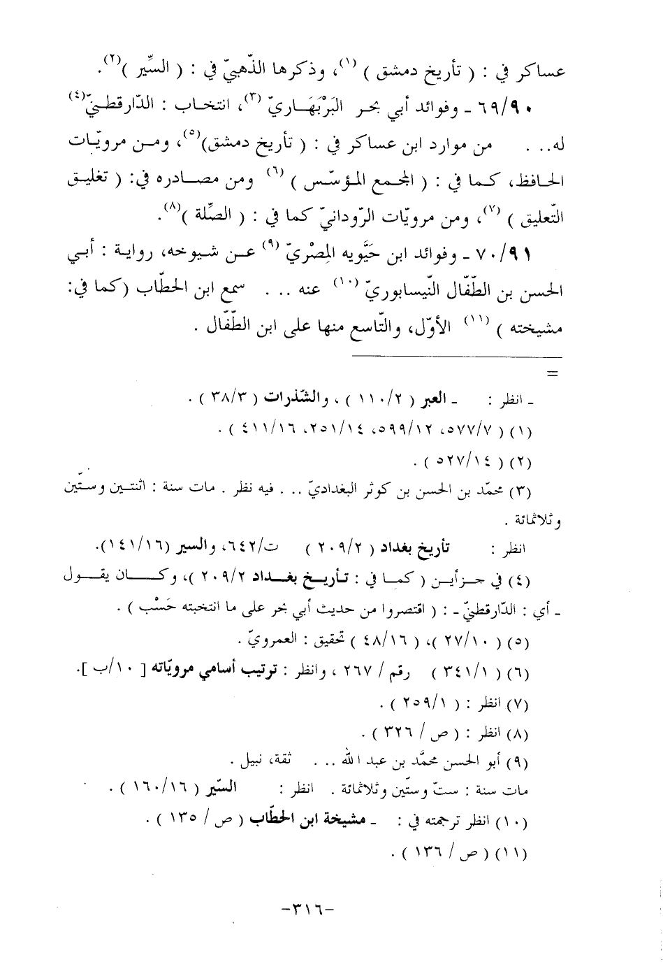 90/69- وفوائد أبي بحر البَرْبَهَاريّ (¬3) ، انتخاب: الدّارقطنيّ (¬4) له ... من موارد ابن عساكر في: (تأريخ دمشق) (¬5) ، ومن مرويّات الحافظ، كما في: (المجمع المؤسّس) (¬6) ومن مصادره في: (تغليق التّعليق) (¬7) ، ومن مرويّات الرّودانيّ كما في: (الصِّلة) (¬8) .