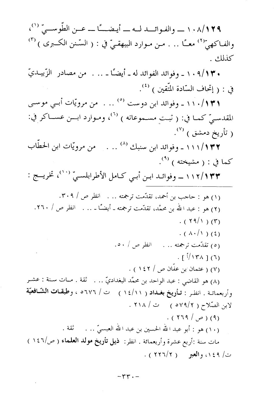 129/108- والفوائد له أيضا عن الطّوسيّ (¬1) ، والفاكهيّ (¬2) معا ... من موارد البيهقيّ في: (السّنن الكبرى) (¬3) كذلك.