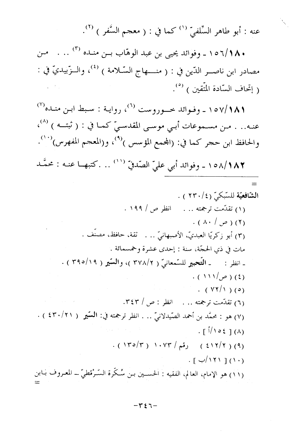 180/156- وفوائد يحيى بن عبد الوهّاب بن منده (¬3) ... من مصادر ابن ناصر الدّين في: (منهاج السّلامة) (¬4) ، والزّبيديّ في: (إتحاف السّادة المتّقين) (¬5) .