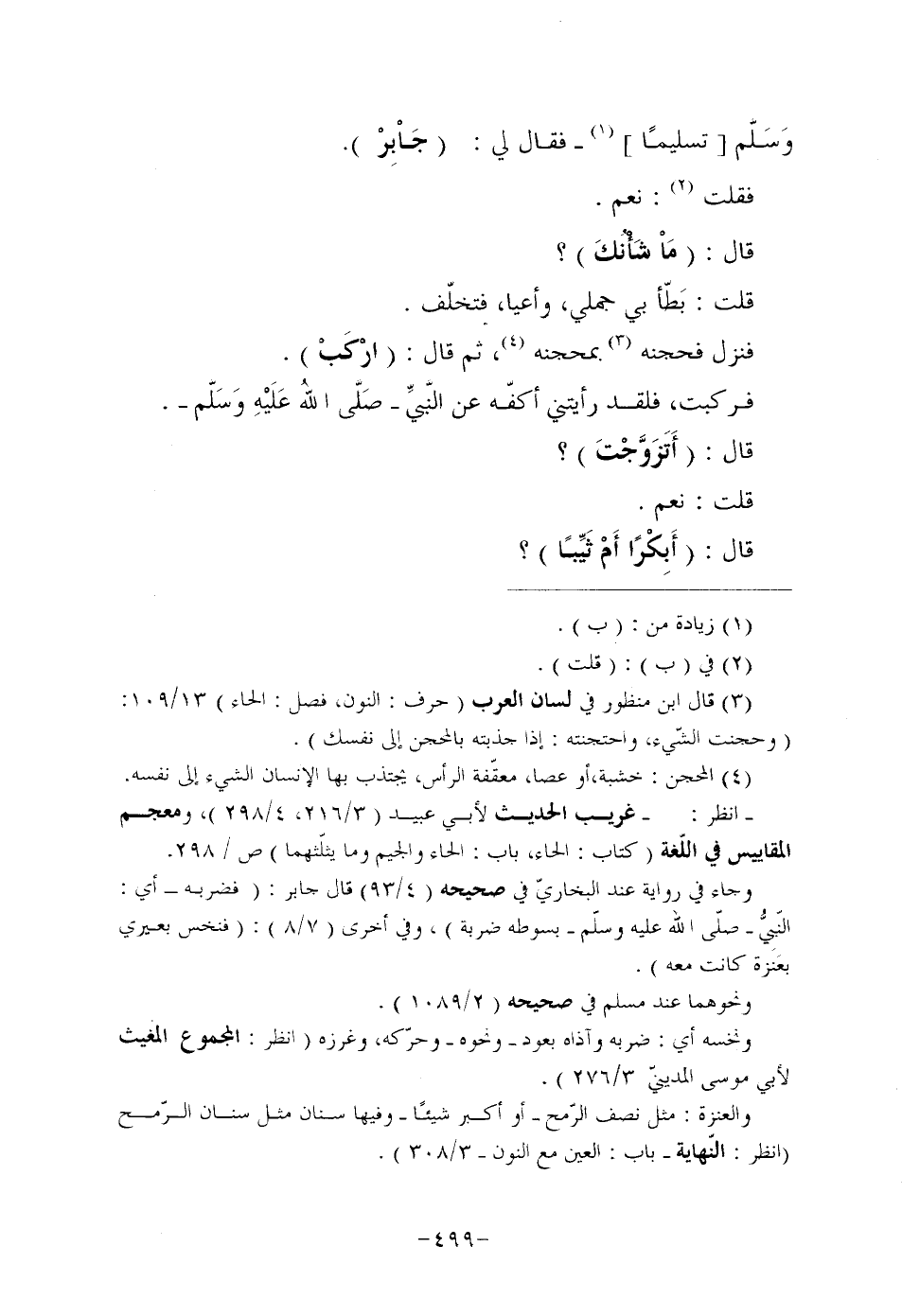 وَسَلَّم [تسليما] (¬1) فقال لي: "جَاْبِرْ". فقلت (¬2) : نَعَمْ. قَالَ: "مَاْ شَأْنُكَ"؟ قُلْتُ: بَطّأ بِي جَمَلِي، وَأَعْيَا، فَتَخَلَّفَ. فَنَزَلَ فَحَجَنَهُ (¬3) بِمِحْجَنَةٍ (¬4) ، ثُمَّ قَالَ: "ارْكَبْ".