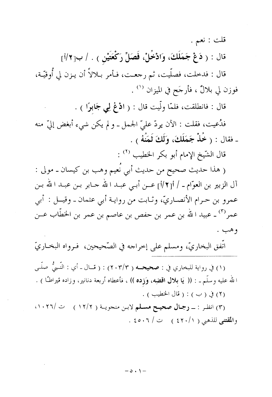 قَالَ الشَّيْخُ الْإِمَامُ أَبُو بَكْرٍ الْخَطِيبُ (¬2) : "هَذَا حَدِيثٌ صَحِيحٌ مِنْ حَدِيثِ أَبِي نُعيم وَهْبِ بْنِ كَيْسَانَ مَوْلَى آلِ الزبير بن العوّام (/أ [2/أ] ) عن أبي عبد الله جابر بن عَبْدِ اللَّهِ بْنِ عَمْرِو بْنِ حَرَامٍ الْأَنْصَارِيِّ، وَثَابِتٌ مِنْ رِوَايَةِ أَبِي عُثْمَانَ وَقِيلَ: أَبِي عُمَرَ (¬3) عُبَيْدِ اللَّهِ بْنِ عُمَرَ بْنِ حَفْصِ بْنِ عَاصِمِ بْنِ عُمَرَ بْنِ الْخَطَّابِ عَنْ وَهْبٍ.