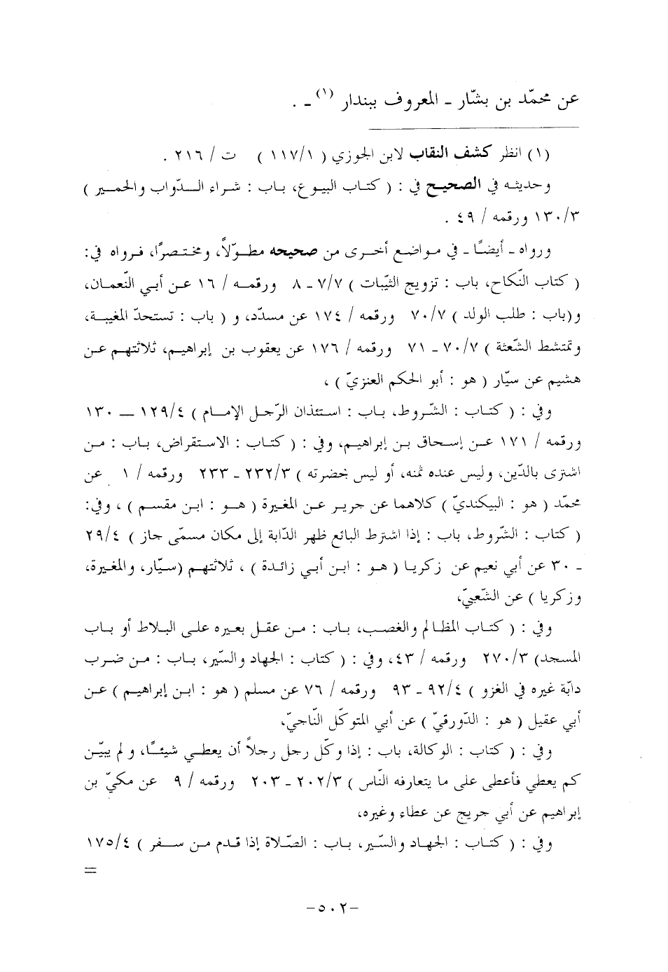 وفي: (كتاب: الشّروط، باب: استئذان الرّجل الإمام) 4/129- 130 ورقمه/171 عن إسحاق بن إبراهيم، وفي: (كتاب: الاستقراض، باب: من اشترى بالدّين، وليس عنده ثمنه، أو ليس بحضرته) 3/232- 233 ورقمه/1 عن محمّد (هو: البيكنديّ) كلاهما عن جرير عن المغيرة (هو: ابن مقسم) ، وفي: (كتاب: الشّروط، باب: إذا اشترط البائع ظهر الدّابة إلى مكان مسمّى جاز) 4/29- 30 عن أبي نعيم عن زكريا (هو: ابن أبي زائدة) ، ثلاثتهم (سيّار، والمغيرة، وزكريا) عن الشّعبيّ، وفي: (كتاب المظالم والغصب، باب: من عقل بعيره على البلاط أو باب المسجد) 3/270 ورقمه/43، وفي: (كتاب: الجهاد والسّير، باب: من ضرب دابّة غيره في الغزو) 4/92- 93 ورقمه/76 عن مسلم (هو: ابن إبراهيم) عن أبي عقيل (هو: الدّورقيّ) عن أبي المتوكّل النّاجيّ، وفي: (كتاب: الوكالة، باب: إذا وكّل رجل رجلاً أن يعطي شيئا، ولم يبيّن كم يعطي فأعطى على ما يتعارفه النّاس) 3/202- 203 ورقمه/9 عن مكيّ بن إبراهيم عن أبي جريج عن عطاء وغيره، وفي: (كتاب: الجهاد والسّير، باب: الصّلاة إذا قدم من سفر) 4/175 ورقمه/282 عن سليمان بن حرب، وَ (باب: الطّعام عند القدوم) 4/175 176 ورقمه/284 عن محمّد (هو: ابن سلام) عن وكيع كلاهما عن شعبة عن محارب ابن دثار، أربعتهم (الشّعبي، وأبو المتوكّل، وعطاء، ومحارب) عن جابر به.