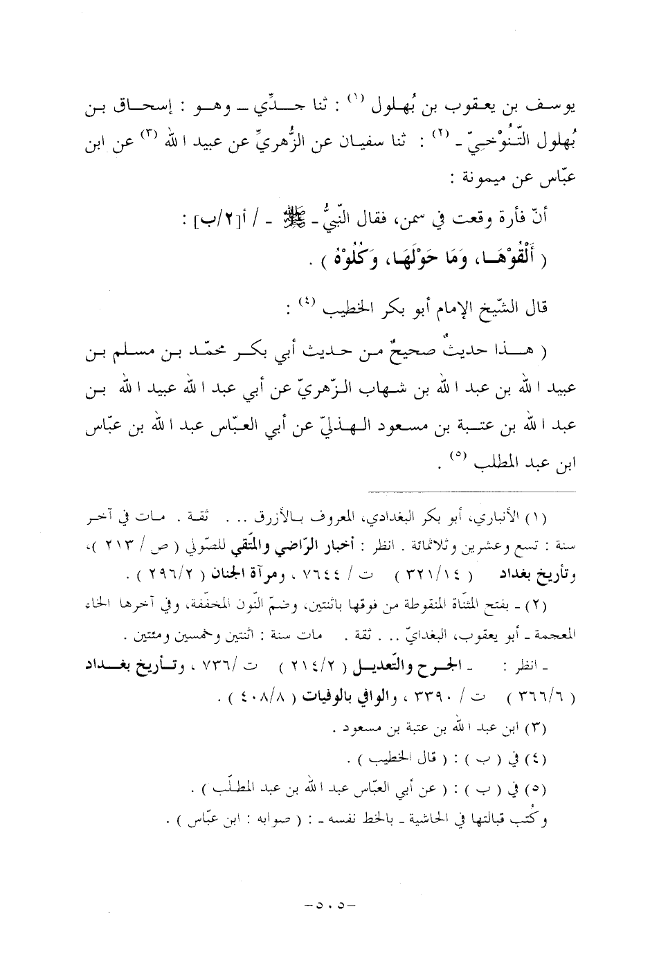 قَالَ الشَّيْخُ الْإِمَامُ أَبُو بَكْرٍ الْخَطِيبُ (¬4) : "هَذَا حديثٌ صحيحٌ مِنْ حَدِيثِ أَبِي بَكْرٍ مُحَمَّدِ بْنِ مُسْلِمِ بْنِ عُبَيْدِ اللَّهِ بْنِ عَبْدِ اللَّهِ بْنِ شِهَابٍ الزِّهْرِيِّ عَنْ أَبِي عَبْدِ اللَّهِ عُبَيْدِ اللَّهِ بْنِ عَبْدِ اللَّهِ بْنِ عُتْبَةَ بْنِ مَسْعُودٍ الْهُذَلِيِّ عَنْ أَبِي الْعَبَّاسِ عَبْدِ اللَّهِ بْنِ عَبَّاسِ ابن عبد المطلب (¬5) .