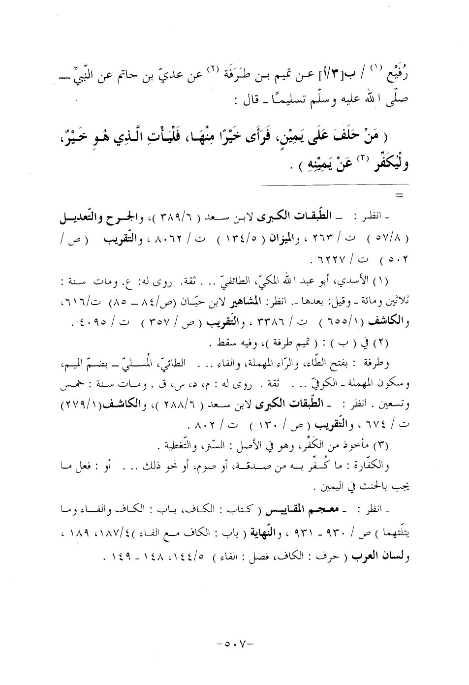 رُفَيْع (¬1) (/ب [3/أ] ) عَنْ تَمِيمِ بْنِ طرَفَة (¬2) عَنْ عَدِيِّ بْنِ حَاتِمٍ عَنِ النَّبيِّ صَلَّى اللَّهُ عَلَيْهِ وَسَلَّمَ تَسْلِيمًا قَالَ: "مَنْ حَلَفَ عَلَى يَمِيْنٍ، فَرَأَى خَيْرًا مِنْهَا، فَلْيَأْتِ الَّذِي هُوِ خَيْرٌ، ولْيُكَفِّر (¬3) عَنْ يَمِيْنِهِ".