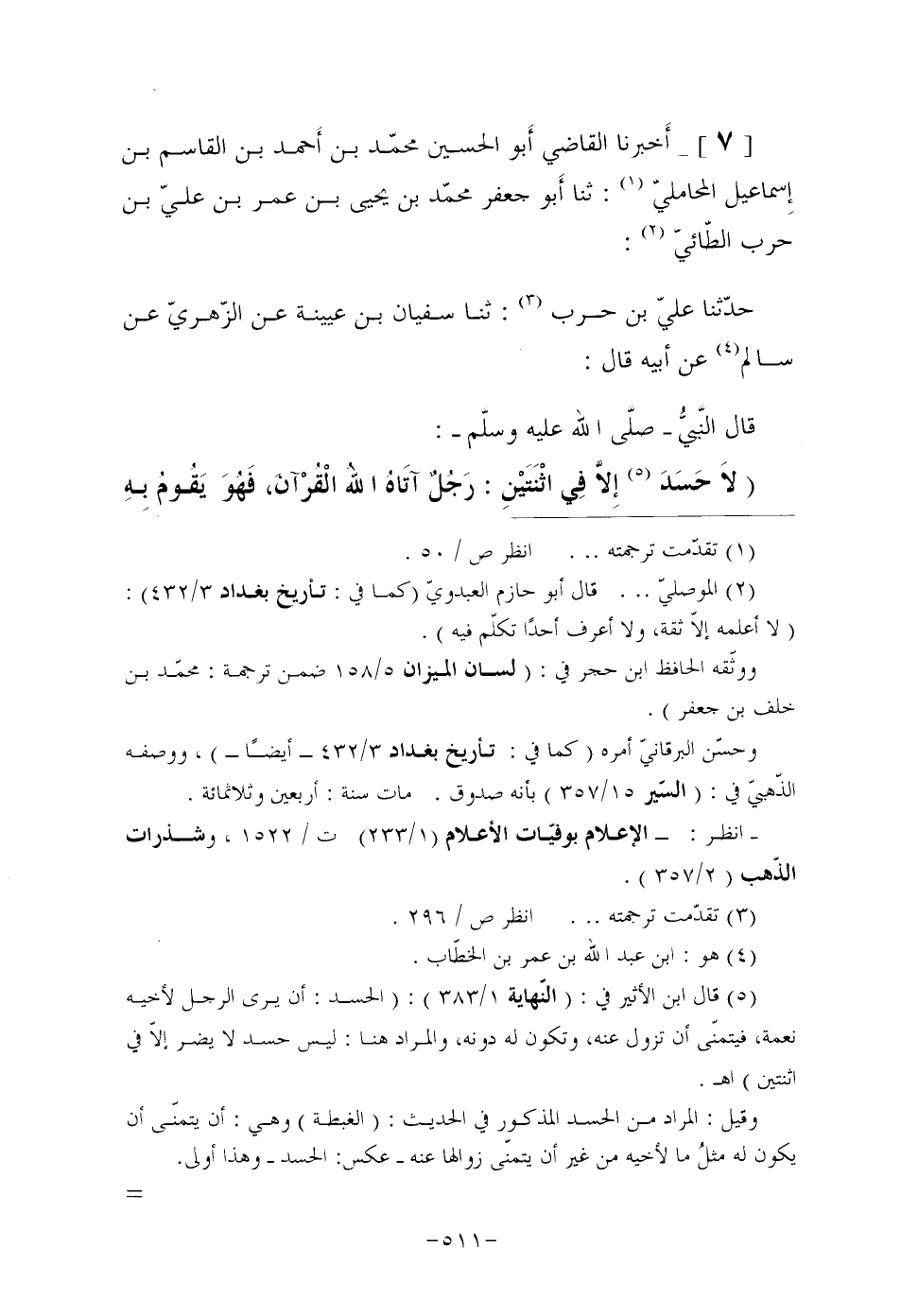 [7]- أَخبرنا الْقَاضِي أَبو الْحُسَيْنِ مُحَمَّدُ بْنُ أَحمد بْنِ الْقَاسِمِ بْنِ إِسماعيل الْمَحَامِلِيُّ (¬1) : ثنا أَبو جَعْفَرٍ مُحَمَّدُ بْنُ يَحْيَى بْنِ عُمَرَ بْنِ عَلِيِّ بْنِ حَرْبٍ الطَّائِيُّ (¬2) : حَدَّثَنَا عَلِيُّ بْنُ حَرْبٍ (¬3) : ثنا سُفْيَانُ بْنُ عُيَيْنَةَ عَنِ الزُّهْرِيِّ عَنْ سَالِمٍ (¬4) عَنْ أَبِيهِ قَالَ: قَالَ النَّبيُّ صلَّى اللَّهُ عَلَيْهِ وسلَّم: "لاَ حَسَدَ (¬5) إِلاَّ فِي اثْنَتَيْنِ: رَجُلٌ آتَاهُ اللهُ الْقُرْآنَ، فَهُوَ يَقُومُ بِهِ