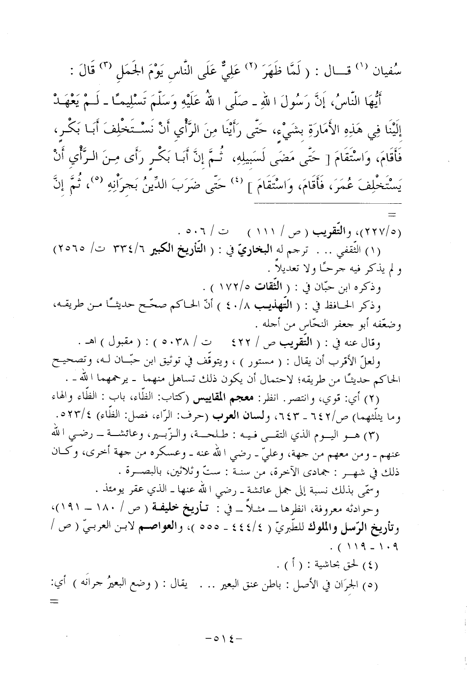 سُفيان (¬1) قَالَ: "لَمَّا ظَهَرَ (¬2) عَلِيٌّ عَلَى النَّاسِ يَوْمَ الجَمَلِ (¬3) قَالَ: أَيُّهَا النَّاسُ، إَنَّ رَسُولَ اللهِ صَلَّى اللهُ عَلَيْهِ وَسَلَّمَ تَسْلِيما لَمْ يَعْهَدْ إِلَيْنَا فِي هَذِهِ الأَمَارَةِ بِشَيْءٍ، حَتَّى رَأَيْنَا مِنَ الرَّأْيِ أَنْ نَسْتَخْلِفَ أَبَا بَكْرٍ، فَأَقَامَ، وَاسْتَقَامَ [حَتَّى مَضَى لَسَبِيلِهِ، ثُمَّ إِنَّ أَبَا بَكْرٍ رَأَى مِنَ الرَّأْيِ أَنْ يَسْتَخْلِفَ عُمَرَ، فَأَقَامَ، وَاسْتَقَامَ] (¬4) حَتَّى ضَرَبَ الدِّينُ بَجِرَاْنِهِ (¬5) ، ثُمَّ إِنَّ