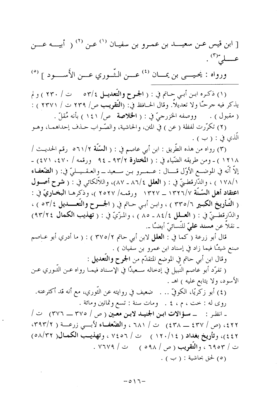 وقال ابن أبي حاتم في الموضع المتقدّم من الجرح والتّعديل: "تفرّد أبو عاصم النّبيل في إدخاله سعيدًا في الإسناد فيما رواه عن الثّوري عن الأسود، ولا يتابع عليه" اهـ.