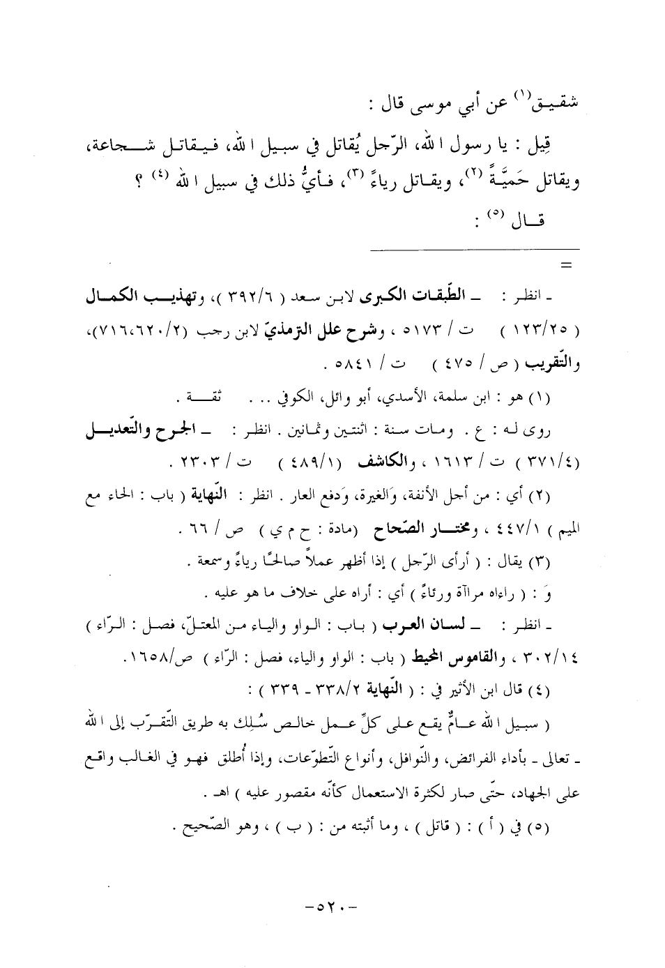 (¬4) قال ابن الأثير في: (النّهاية 2/338- 339) : "سبيل الله عامٌّ يقع على كلِّ عمل خالص سُلِك به طريق التّقرّب إلى الله تعالى بأداء الفرائض، والنّوافل، وأنواع التّطوّعات، وإذا أُطلق فهو في الغالب واقع على الجهاد، حتّى صار لكثرة الاستعمال كأنّه مقصور عليه" اهـ.