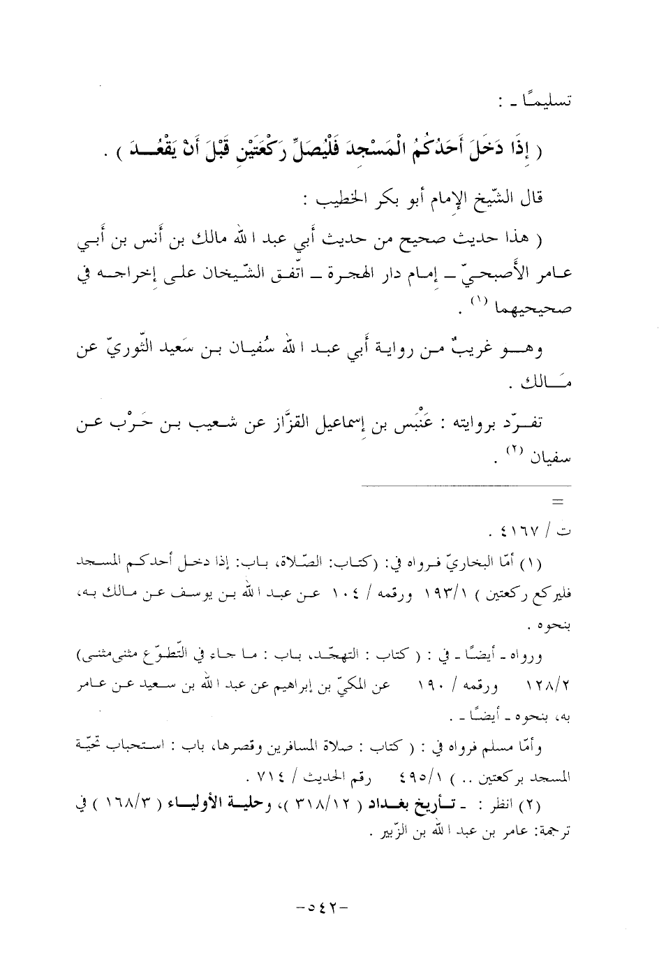 (¬1) أمّا البخاريّ فرواه في: (كتاب: الصّلاة، باب: إذا دخل أحدكم المسجد فليركع ركعتين) 1/193 ورقمه/104 عَنْ عَبْدِ اللَّهِ بْنِ يُوسُفَ عن مالك به، بنحوه.