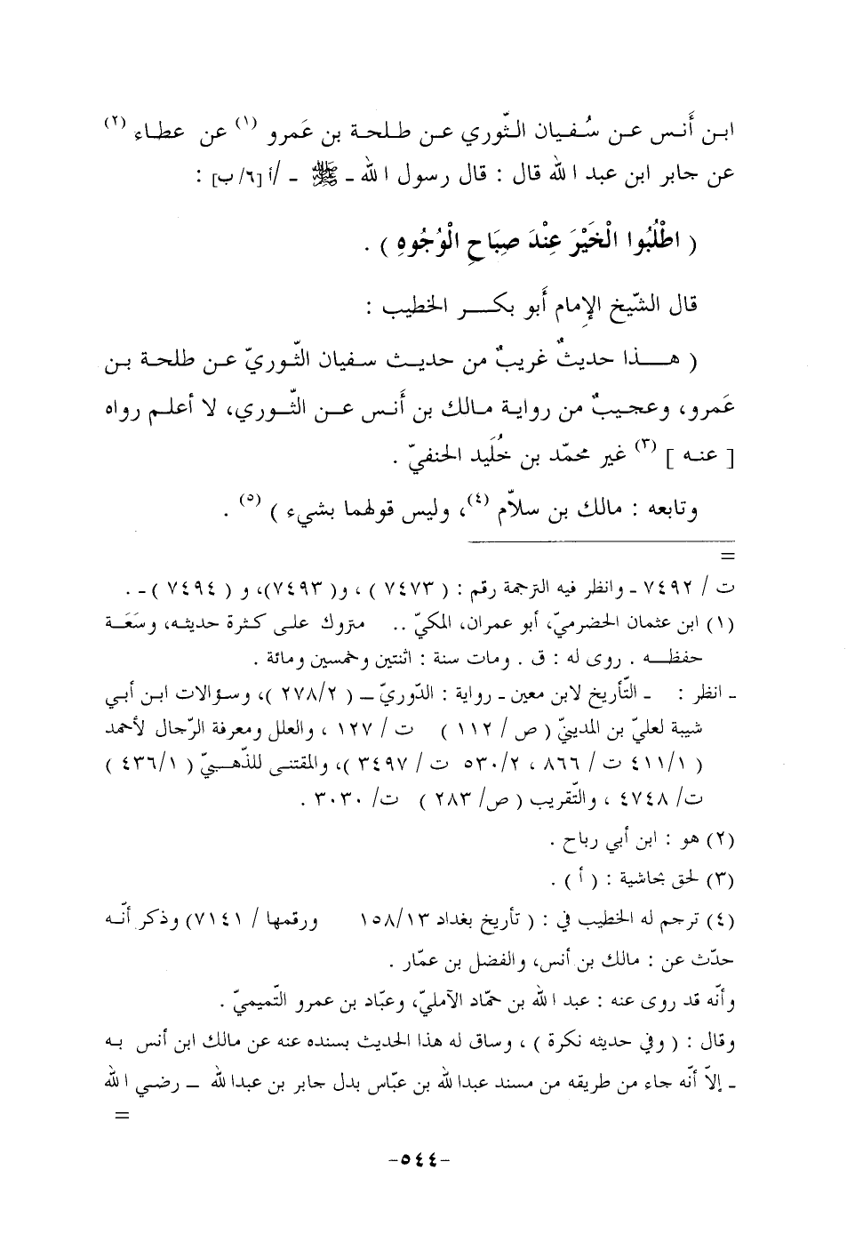 ابن أَنس عَنْ سُفيان الثَّوْرِيِّ عَنْ طَلْحَةَ بْنِ عَمرو (¬1) عَنْ عَطَاءٍ (¬2) عن جابر ابن عَبْدِ اللَّهِ قَالَ: قَالَ رَسُولُ اللَّهِ صَلَّى اللهُ عَلَيْهِ وَسَلَّمَ /أ [6/ ب] : "اطْلُبُوا الْخَيْرَ عِنْدَ صِبَاحِ الْوُجُوهِ".