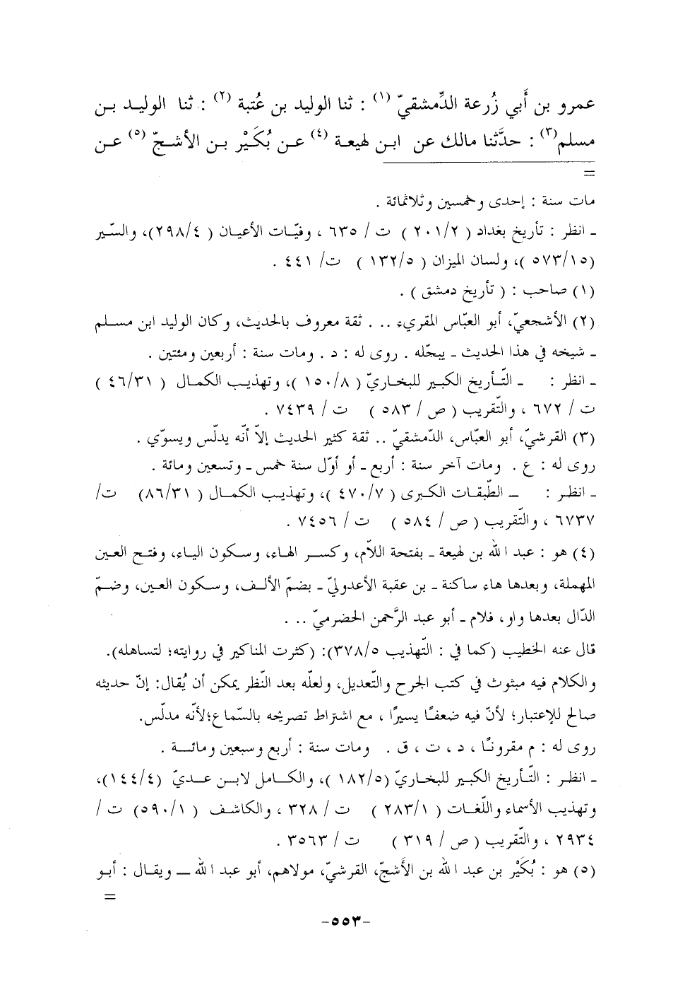 عَمْرِو بْنِ أَبي زُرعة الدِّمشقيّ (¬1) : ثنا الْوَلِيدُ بْنُ عُتبة (¬2) : ثنا الْوَلِيدُ بْنُ مُسْلِمٍ (¬3) : حدَّثنا مَالِكٌ عَنِ ابْنِ لَهِيعَةَ (¬4) عَنْ بُكَيْر بن الأشجّ (¬5) عن