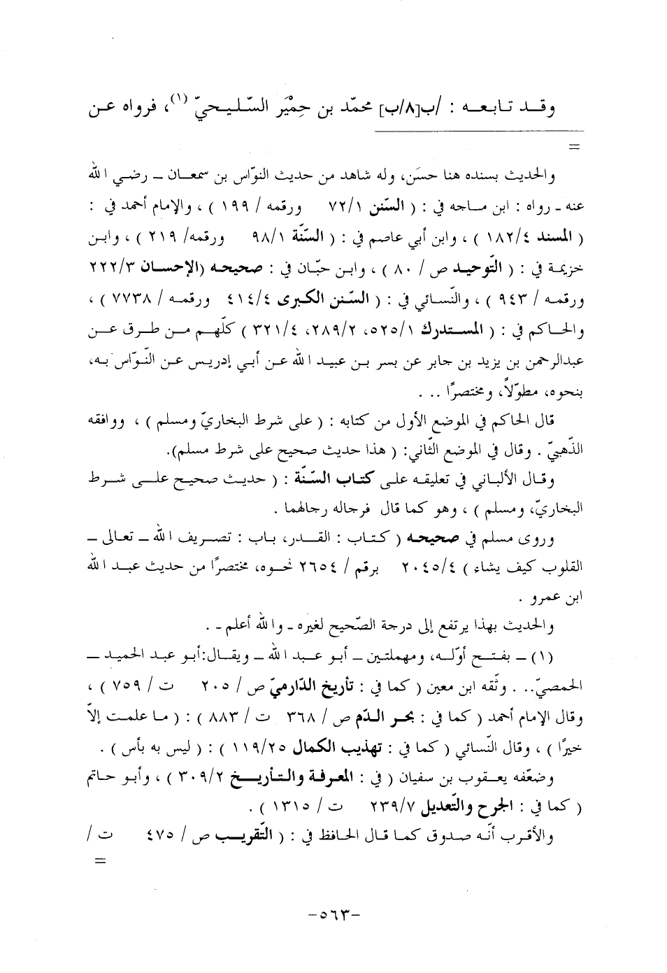 وتابعه - أيضا: عمرو بن بشر بن السّرح، إلاّ أنّه جعله من مسند النّوّاس بن سمعان ... ذكر إسناد روايته: ابن أبي حاتم في: (العلل 2/117) .
