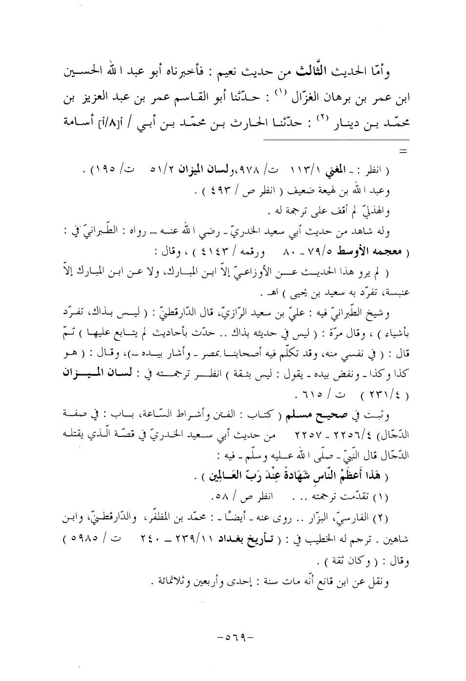 وَأَمَّا الْحَدِيثُ الثَّالث مِنْ حَدِيثِ نُعَيْمٍ: فَأَخْبَرَنَاهُ أَبُو عَبْدِ اللَّهِ الحسين ابن عُمَرَ بْنِ بُرْهَانَ الْغَزَّالُ (¬1) : حَدَّثَنَا أَبُو الْقَاسِمِ عُمَرُ بْنُ عَبْدِ العزيز بن محمّد بن دِينَارٌ (¬2) : حَدَّثَنَا الْحَارِثُ بْنُ مُحَمَّدِ بن أبي / أ [8/أ] أسامة