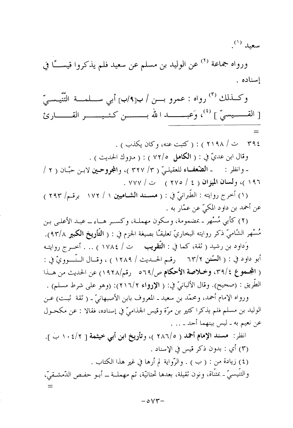 (¬2) كأبي مُسْهر - بمضمومة، وسكون مهملة، وكسر هاء - عبد الأعلى بن مُسْهر الشّاميّ ذكر روايته البخاريّ تعليقا بصيغة الجزم في: (التّأريخ الكبير 8/93) .