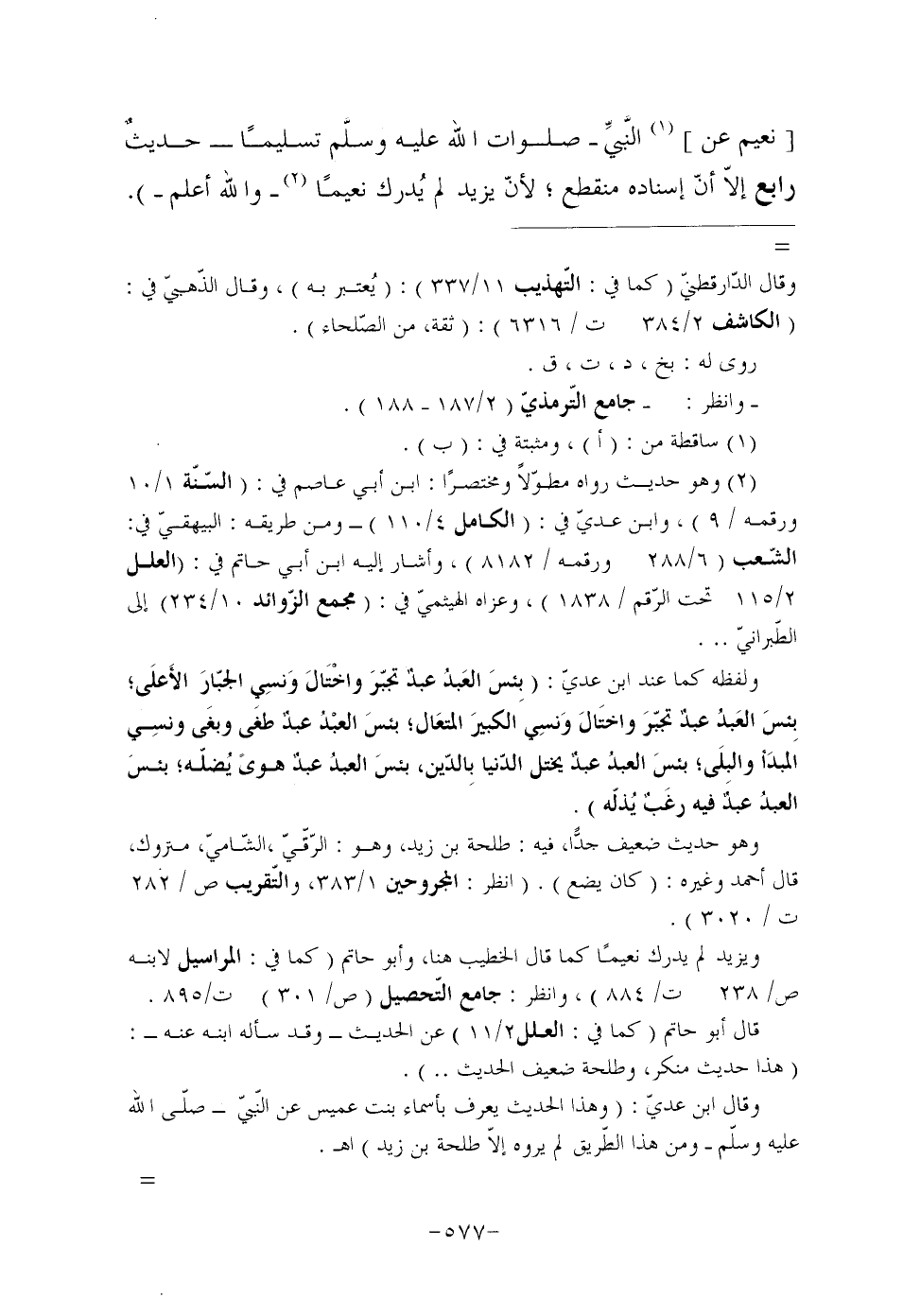 [نعيم عَنِ] (¬1) النَّبيِّ صَلَوَاتُ اللَّهُ عَلَيْهِ وسلَّم تَسْلِيمًا حديثٌ رَابِعٌ إِلَّا أَنَّ إِسْنَادَهُ مُنْقَطِعٌ؛ لِأَنَّ يَزِيدَ لَمْ يُدرك نُعَيْمًا (¬2) وَاللَّهُ أَعْلَمُ".