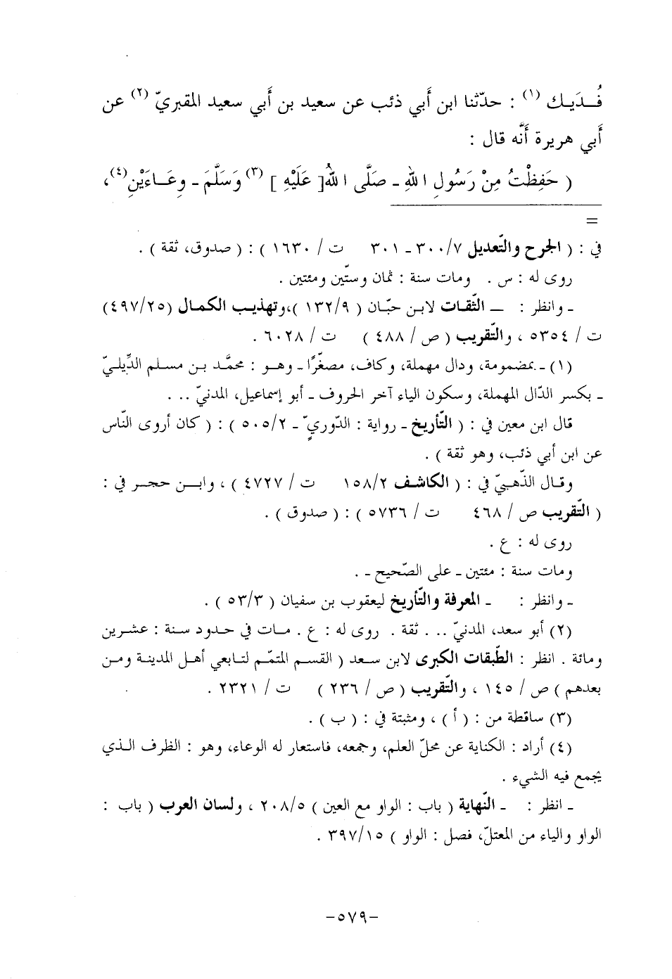 فُدَيك (¬1) : حَدَّثَنَا ابْنُ أَبي ذِئْبٍ عَنْ سَعِيدِ بْنِ أَبي سَعِيدٍ الْمَقْبُرِيِّ (¬2) عَنْ أَبي هُرَيْرَةَ أَنَّه قَالَ: "حَفِظْتُ مِنْ رَسُولِ اللهِ صَلَّى اللهُ [عَلَيْهِ] (¬3) وَسَلَّمَ وِعَاءَيْنِ (¬4) ،