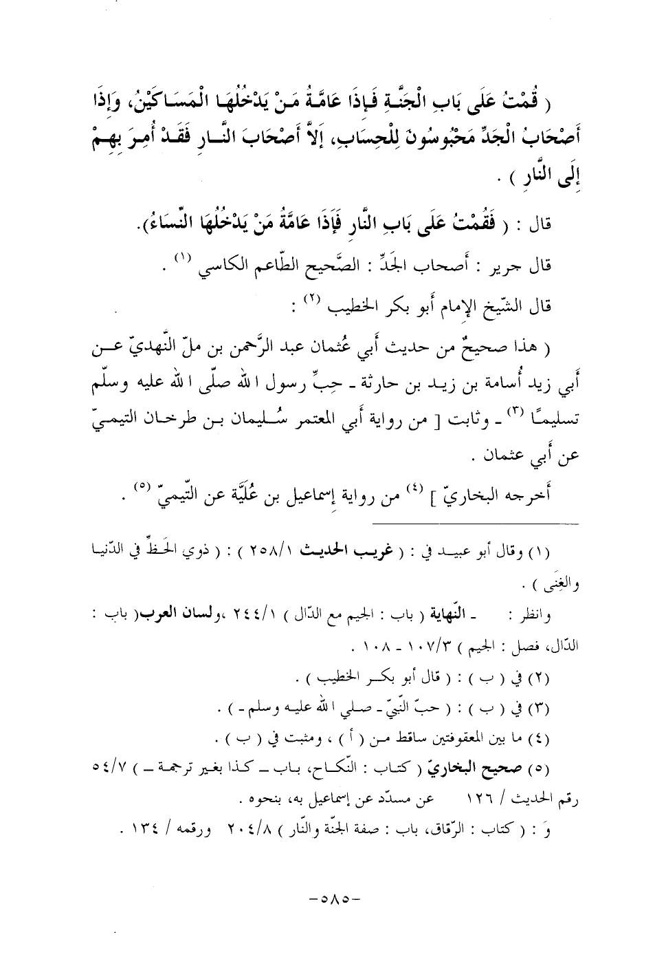 "قُمْتُ عَلَى بَابِ الْجَنَّةِ فَإِذَا عَامَّةُ مَنْ يَدْخُلُهَا الْمَسَاكَيْنُ، وَإِذَا أَصْحَابُ الْجَدِّ مَحْبُوسُونَ لِلْحِسَابِ، إَلاَّ أَصْحَابَ النَّارِ فَقَدْ أُمِرَ بِهِمْ إِلَى النَّارِ". قَالَ: "فَقُمْتُ عَلَى بَابِ النَّارِ فَإَذَا عَامَّةُ مَنْ يَدْخُلُهَا النِّسَاءُ".