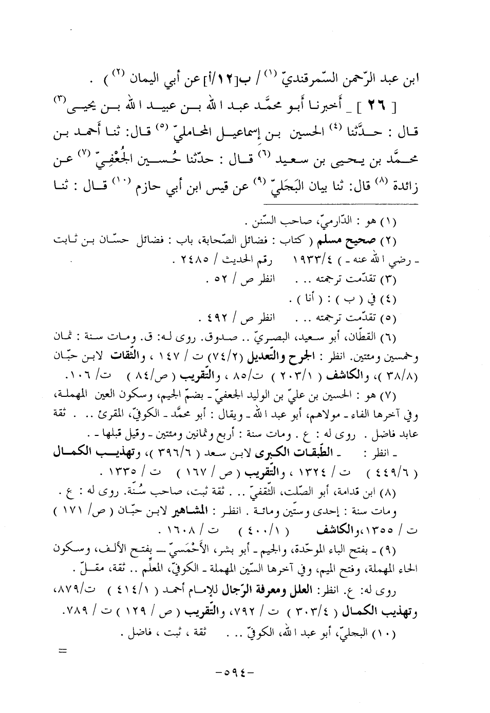 [26]- أَخبرنا أَبو محمَّد عَبْدُ اللَّهِ بْنُ عُبَيْدِ اللَّهِ بْنِ يَحْيَى (¬3) قَالَ: حدَّثنا (¬4) الْحُسَيْنُ بْنُ إِسماعيل الْمَحَامِلِيُّ (¬5) قَالَ: ثنا أَحمد بْنُ محمَّد بْنِ يَحْيَى بْنِ سَعِيدٍ (¬6) قَالَ: حَدَّثَنَا حُسين الجُعْفِيّ (¬7) عَنْ زَائِدةَ (¬8) قَالَ: ثنا بَيَانٌ البَجَليّ (¬9) عن قيس ابن أبي حازم (¬10) قال: ثنا