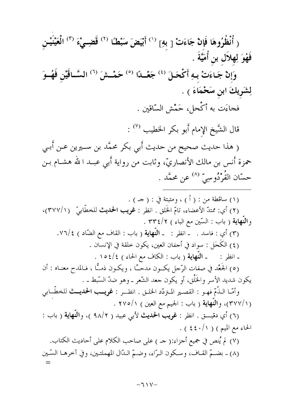 قَالَ الشَّيخ الإِمام أَبو بَكْرٍ الْخَطِيبُ (¬7) : "هَذَا حَدِيثٌ صَحِيحٌ مِنْ حَدِيثِ أَبي بَكْرٍ محمَّد بْنِ سِيرِينَ عَنْ أَبي حَمْزَةَ أَنس بْنِ مَالِكٍ الْأَنْصَارِيِّ، وَثَابِتٌ مِنْ رِوَايَةِ أَبي عَبْدِ اللَّهِ هشام بن حسّان القُرْدُوسِيّ (¬8) عن محمَّد,