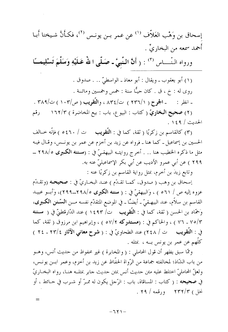وتابع زيدَ بن أخرم، بمثل رواية القاسم بن زكريّا عنه: إسحاق بن وهب (صدوق، كما تقدّم) عند البخاريّ في: صحيحه (وتقدّم عزوه إليه ص/561) ، وَالبيهقيّ في: (سننه الكبرى 5/298- 299) ، وَأبو عبيد القاسم بن سلاّم، عند البيهقيّ أيضا في الموضع المتقدّم نفسه من السّنن الكبرى، وَحمّاد بن الحسن (ثقة، كما في: التّقريب ت/1493) عند الدّارقطنيّ في (سننه 3/75- 76) ، والحاكم في: (مستدركه 2/57) ، وإبراهيم ابن مرزوق (ثقة، كما في: التّقريب ت/248) عند الطحاويّ في: (شرح معاني الآثار 4/23- 24) كلّهم عن عمر بن يونس به، بمثله.