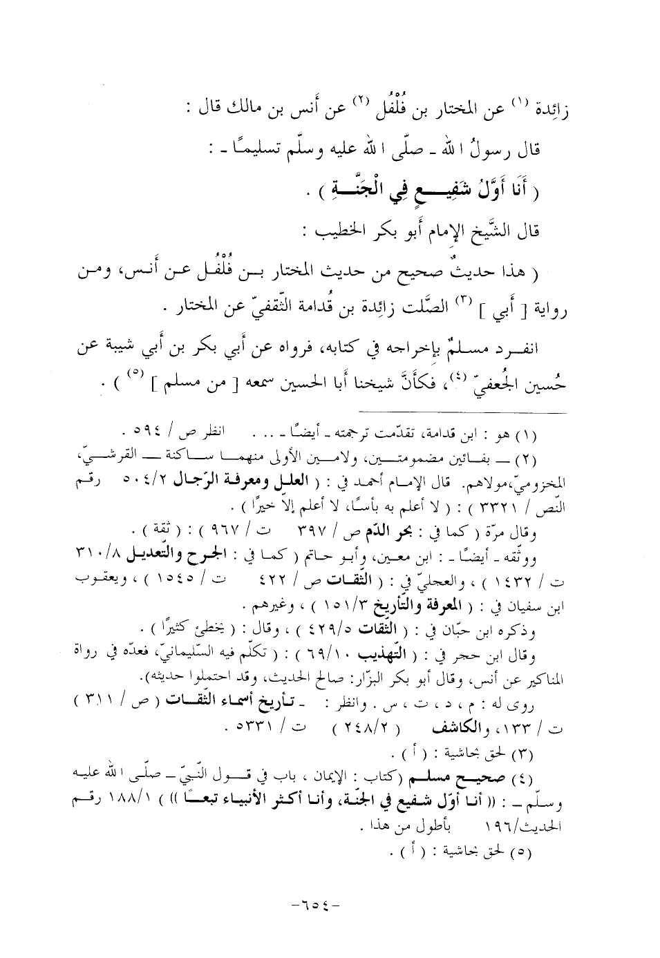 زائِدة (¬1) عَنِ الْمُخْتَارِ بْنِ فُلْفُل (¬2) عَنْ أَنس بْنِ مَالِكٍ قَالَ: قَالَ رسولُ اللَّهِ صلَّى اللَّهُ عليه وسلَّم سليما: "أَنَا أَوَّلُ شَفِيعٍ فِي الْجَنَّةِ".