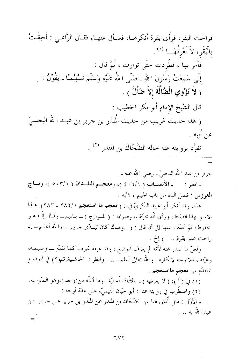 قَالَ الشَّيخ الإِمام أَبو بَكْرٍ الْخَطِيبُ: "هَذَا حَدِيثٌ غَرِيبٌ مِنْ حَدِيثِ المُنذر بْنِ جَرِيرِ بْنِ عَبْدِ اللَّهِ الْبَجَلِيِّ عَنْ أَبيه,
