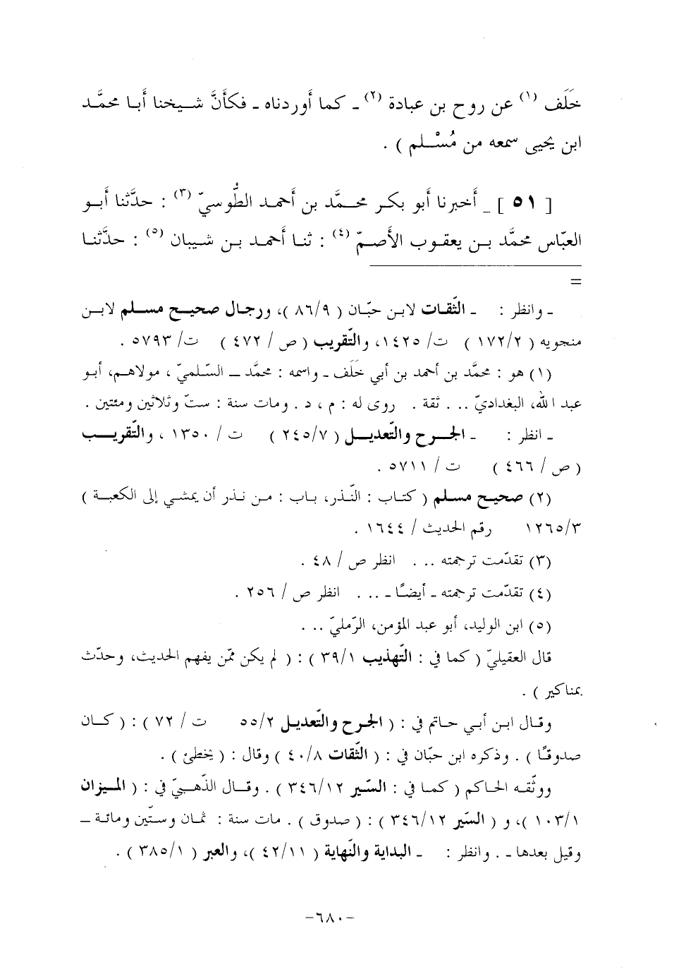 خَلَف (¬1) عَنْ رَوْحِ بْنِ عُبَادَةَ (¬2) كَمَا أَوردناه فكأَنَّ شَيْخَنَا أَبا محمَّد ابن يَحْيَى سَمِعَهُ مِنْ مُسْلم".