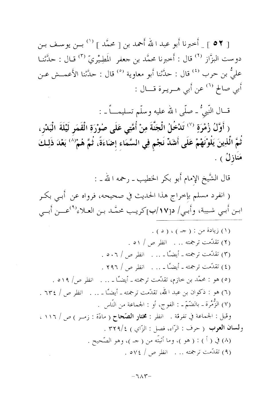 [52]- أَخبرنا أَبو عَبْدِ اللَّهِ أَحمد بْنُ [محمَّد] (¬1) بْنِ يُوسُفَ بْنِ دُوَسْتَ البزَّاز (¬2) قَالَ: أَخبرنا محمَّد بْنُ جَعْفَرٍ المَطِيْريّ (¬3) قَالَ: حدَّثنا عليُّ بْنُ حَرْبٍ (¬4) قَالَ: حدَّثنا أَبو مُعَاوِيَةَ (¬5) قَالَ: حدَّثنا الأَعمش عَنْ أَبي صَالِحٍ (¬6) عَنْ أَبي هُرَيْرَةَ قَالَ: قَالَ النَّبيُِّ صَلَّى اللَّهُ عَلَيْهِ وَسَلَّمَ تَسْلِيمًا: "أَوَّلُ زُمْرَةٍ (¬7) تَدْخُلُ الْجَنَّةَ مِنْ أُمَّتِي عَلَى صُوْرَةِ الْقَمَرِ لَيْلَةَ الْبَدْرِ، ثُمَّ الَّذِينَ يَلُوْنَهْمْ عَلَى أَشَدِّ نَجْمٍ فِي السَّمَاءِ إِضَاءَةً، ثُمَّ هُمْ (¬8) بَعْدَ ذَلِكَ مَنَازِلُ".