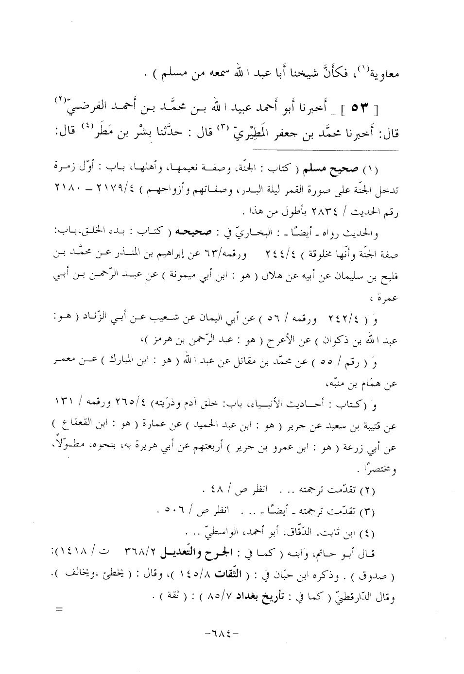 [53]- أَخبرنا أَبو أَحمد عُبَيْدُ اللَّهِ بْنُ محمَّد بْنِ أَحمد الْفَرَضِيُّ (¬2) قَالَ: أَخبرنا محمَّد بْنُ جَعْفَرٍ المَطِيْريّ (¬3) قَالَ: حدَّثنا بِشْر بْنُ مَطَر (¬4) قال: