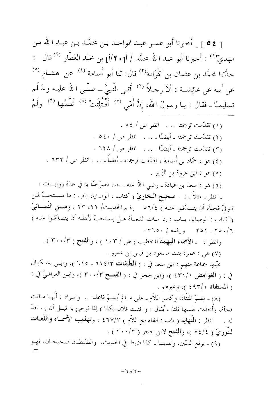 [54]- أَخبرنا أَبو عُمَرَ عَبْدُ الْوَاحِدِ بْنُ محمَّد بْنِ عَبْدِ اللَّهِ بْنِ مَهْدِيٍّ (¬1) : أَخبرنا أَبو عَبْدِ الله محمَّد / (أ [20/أ] ) بْنُ مَخْلَدٍ العَطَّار (¬2) قَالَ: حدَّثنا محمَّد بْنُ عُثْمَانَ بْنِ كَرَامة (¬3) قَالَ: ثنا أَبو أُسامة (¬4) عَنْ هِشَامٍ (¬5) عَنْ أَبيه عَنْ عائِشة: أَنَّ رَجُلًا (¬6) أَتى النَّبيَّ صَلَّى اللَّهُ عَلَيْهِ وسَلّم تَسْلِيمًا فَقَالَ: يَا رسولَ اللَّهِ، إِنَّ أُمّي (¬7) أُفْتُلِتَتْ (¬8) نَفْسُها (¬9) ولَمْ
