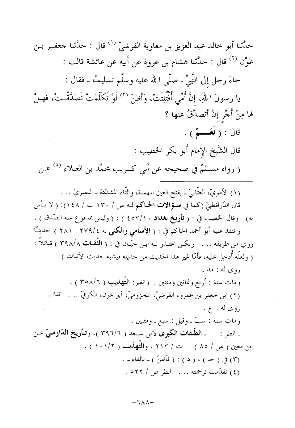 حدَّثنا أَبُو خَالِدٍ عَبْدُ الْعَزِيزِ بْنُ مُعَاوِيَةَ الْقُرَشِيُّ (¬1) قَالَ: حدَّثنا جَعْفَرُ بْنُ عَوْن (¬2) قَالَ: حدَّثنا هِشَامِ بْنِ عُرْوَةَ عَنْ أَبيه عَنْ عَائِشَةَ قَالَتْ: جاءَ رَجُلٌ إِلى النَّبيِّ صلَّى اللَّهُ عَلَيْهِ وَسَلَّمَ تَسْلِيمًا فَقَالَ: يَا رسولَ اللهِ، إِنَّ أُمِّي أُفْتُلِتَتْ، وَأَظنّ (¬3) لَوْ تَكَلَّمَتْ تَصَدَّقّتْ، فهلْ لَهَا مِنْ أَجْرٍ إِنْ أتصدَّقُ عَنْهَا؟ قالَ: "نَعَمْ".