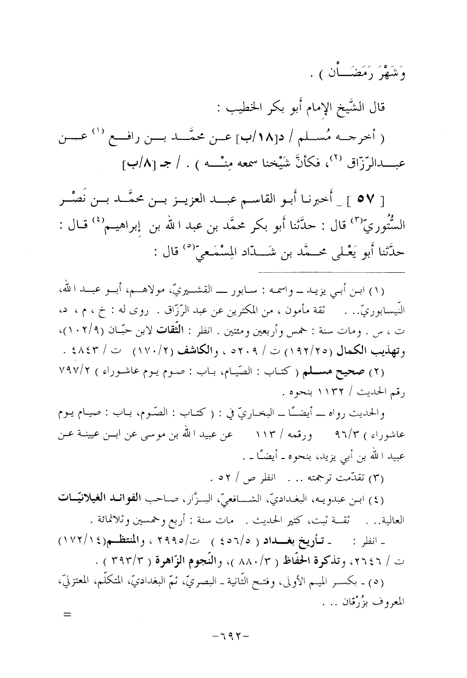 قَالَ الشَّيخ الإِمام أَبو بَكْرٍ الْخَطِيبُ: "أَخْرَجَهُ مُسلم/د [18/ب] عَنْ محمَّد بْنِ رَافِعٍ (¬1) عَنْ عَبْدِ الرَّزَّاقِ (¬2) ، فكأنَّ شَيْخنا سَمِعَهُ مِنه"./ (ج [8/ب] )