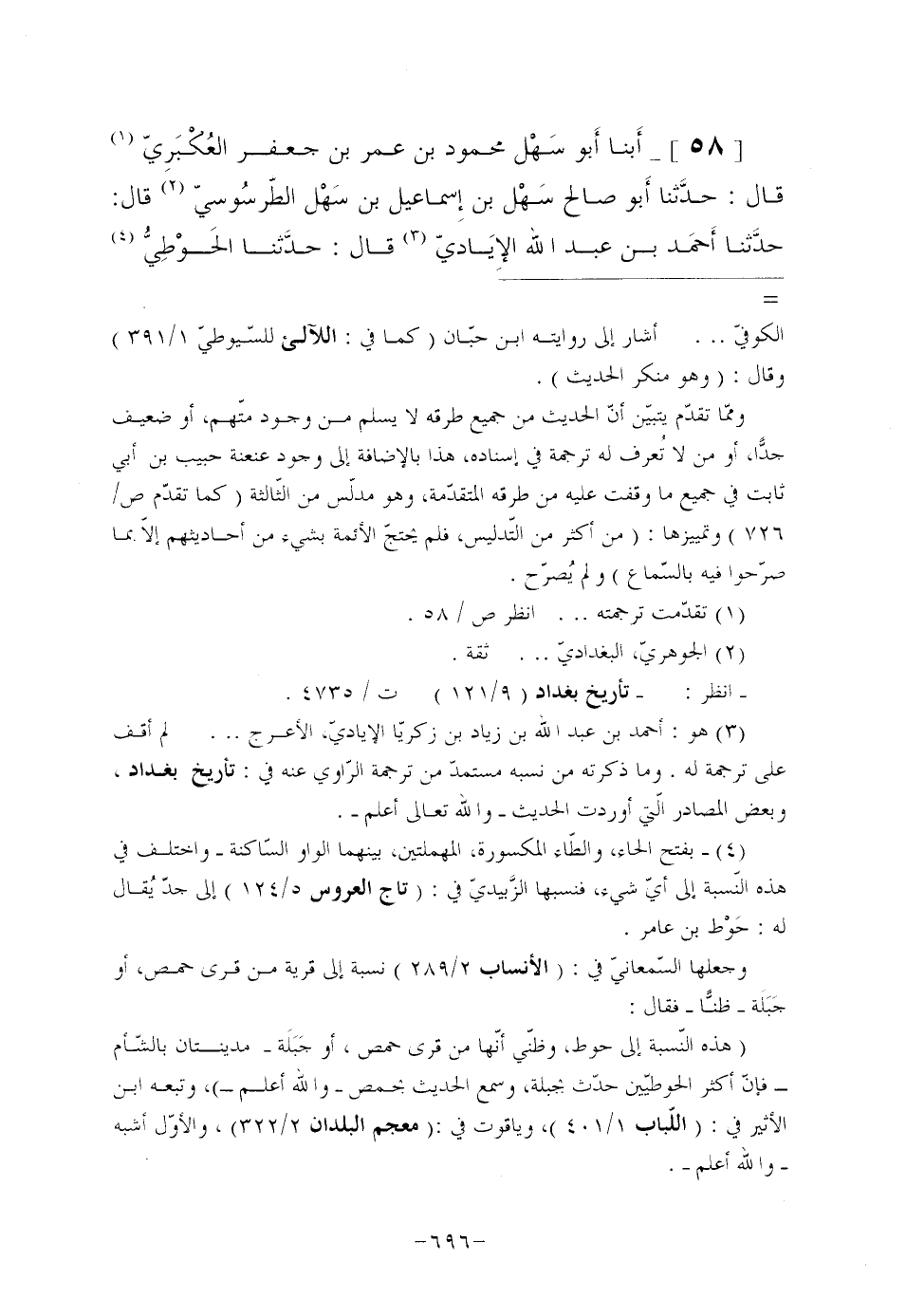 [58]- أَبنا أَبو سَهْل مَحْمُودُ بْنُ عُمَرَ بْنِ جَعْفَرٍ العُكْبَرِيّ (¬1) قَالَ: حدَّثنا أَبو صَالِحٍ سَهْل بْنُ إِسماعيل بْنِ سَهْل الطَّرسُوسيّ (¬2) قَالَ: حدَّثنا أَحمَد بْنُ عَبْدِ اللَّهِ الإِيَاديّ (¬3) قال: حدَّثنا الحَوْطِيُّ (¬4)