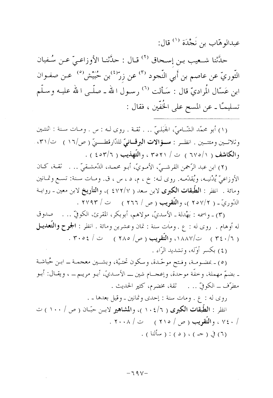 عَبْدُ الْوَهَّابِ بْنُ نَجْدَة (¬1) قَالَ: حدَّثنا شُعَيْبُ بْنُ إِسحاق (¬2) قَالَ: حدَّثنا الْأَوْزَاعِيُّ عَنْ سُفيان الثَّوْرِيِّ عَنْ عَاصِمِ بْنِ أَبي النُّجُودِ (¬3) عَنْ زِرّ (¬4) بْنِ حُبَيْش (¬5) عَنْ صفوان ابن عَسّال المُراديّ قَالَ: سَألت (¬6) رَسُولَ اللَّهِ صلَّى اللَّهُ عَلَيْهِ وسلَّم تَسْلِيمًا عَنِ الْمَسْحِ عَلَى الخُفّين، فقال: