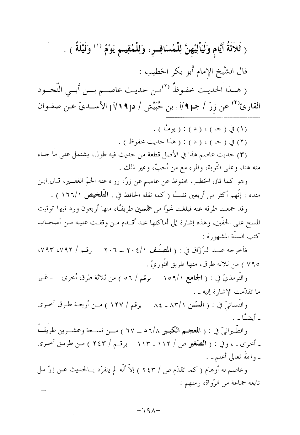 قَالَ الشَّيخ الإِمام أَبو بَكْرٍ الْخَطِيبُ: "هَذَا الْحَدِيثُ محفوظٌ (¬2) مِنْ حَدِيثِ عَاصِمِ بْنِ أَبي النُّجُودِ الْقَارِئِ (¬3) عَنْ زِرّ/ (ج [9/أ] ) بن حُبَيْش/ (د [19/أ] ) الأسديّ عن صفوان