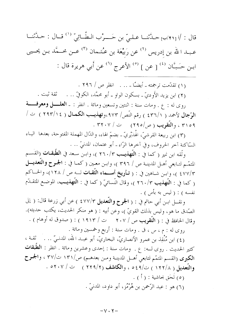 قال:/ (أ [21/ب] ) حدَّثنا عَلِيُّ بْنُ حَرْب الطَّائِيّ (¬1) قَالَ: حدَّثنا عَبْدُ اللَّهِ بْنُ إِدريس (¬2) عَنْ رَبِيْعَة بْنِ عُثْمَانَ (¬3) عن محمَّد بن يحيى ابن حِبَّانَ (¬4) [عَنِ] (¬5) الْأَعْرَجِ (¬6) عَنْ أَبي هريرة قال: