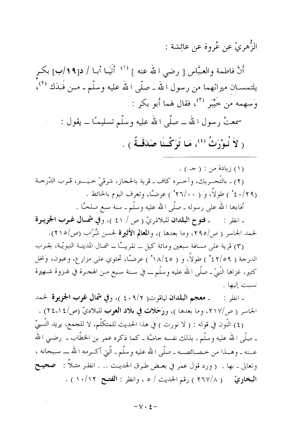 (¬4) النّون في قوله: "لا نورث" في هذا الحديث للمتكلّم، لا للجمع، يريد النّبيّ صلّى الله عليه وسلّم بذلك نفسه خاصّة كما ذكره عمر بن الخطّاب رضي الله عنه وهذا من خصائصه صلّى الله عليه وسلّم الّتي أكرمه الله سبحانه، وتعالى بها. (ورد قول عمر في بعض طرق الحديث ... انظر مثلاً: صحيح البخاريّ (8/267) رقم الحديث/5، وانظر: الفتح 12/10) .