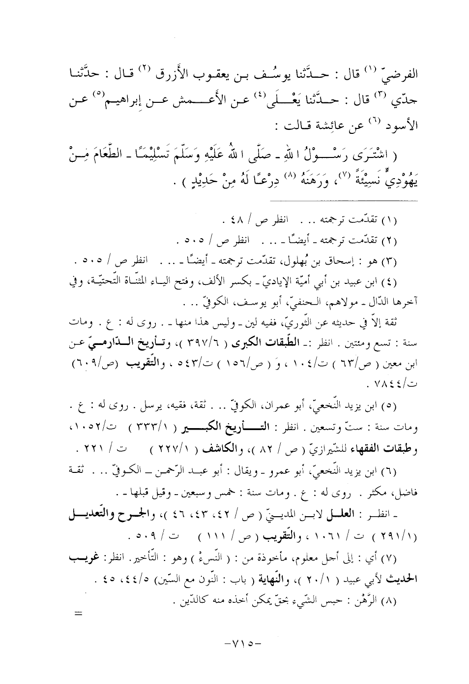 الْفَرَضِيُّ (¬1) قَالَ: حدَّثنا يوسُف بْنُ يَعْقُوبَ الأَزرق (¬2) قَالَ: حدَّثنا جَدِّي (¬3) قَالَ: حدَّثنا يَعْلَى (¬4) عَنِ الأَعمش عَنْ إِبراهيم (¬5) عَنِ الْأَسْوَدِ (¬6) عَنْ عائِشة قَالَتْ: "اشْترَى رَسْوْلُ اللهِ صَلَّى اللهُ عَلَيْهِ وَسَلَّمَ تَسْلِيْمَا الطَّعَامَ مِنْ يَهُوْدِيٍّ نَسِيْئَةً (¬7) ، وَرَهَنَهُ (¬8) دِرْعا لَهُ مِنْ حَدِيْدٍ".