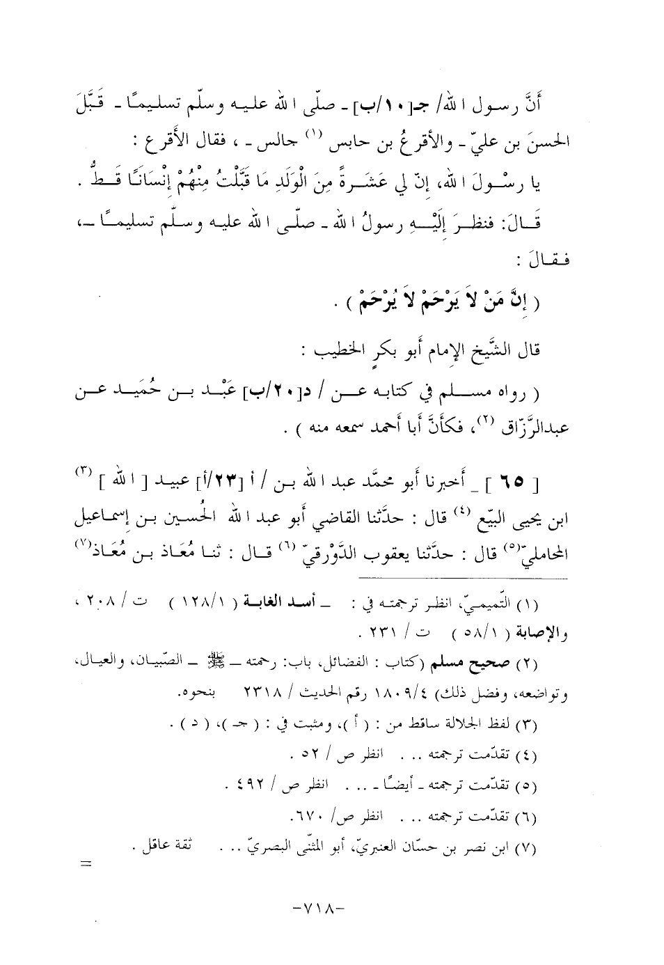 أَنَّ رسول الله/ (ج [10/ب] ) صَلَّى اللَّهُ عَلَيْهِ وَسَلَّمَ تَسْلِيمًا قَبَّلَ الحسنَ بْنَ عَلِيٍّ والأقرعُ بن حابس (¬1) جالس، فَقَالَ الأَقرع: يَا رسْولَ اللَّهِ، إِنّ لِي عَشَرةً مِنَ الْوَلَدِ مَا قَبَّلْتُ مِنْهُمْ إِنْسَانَا قَطُّ. قَالَ: فنظرَ إِلَيْهِ رسولُ اللَّهِ صلَّى اللَّهُ عَلَيْهِ وسلَّم تَسْلِيمًا، فقالَ: "إِنَّ مَنْ لاَ يَرْحَمْ لاَ يُرْحَمْ".