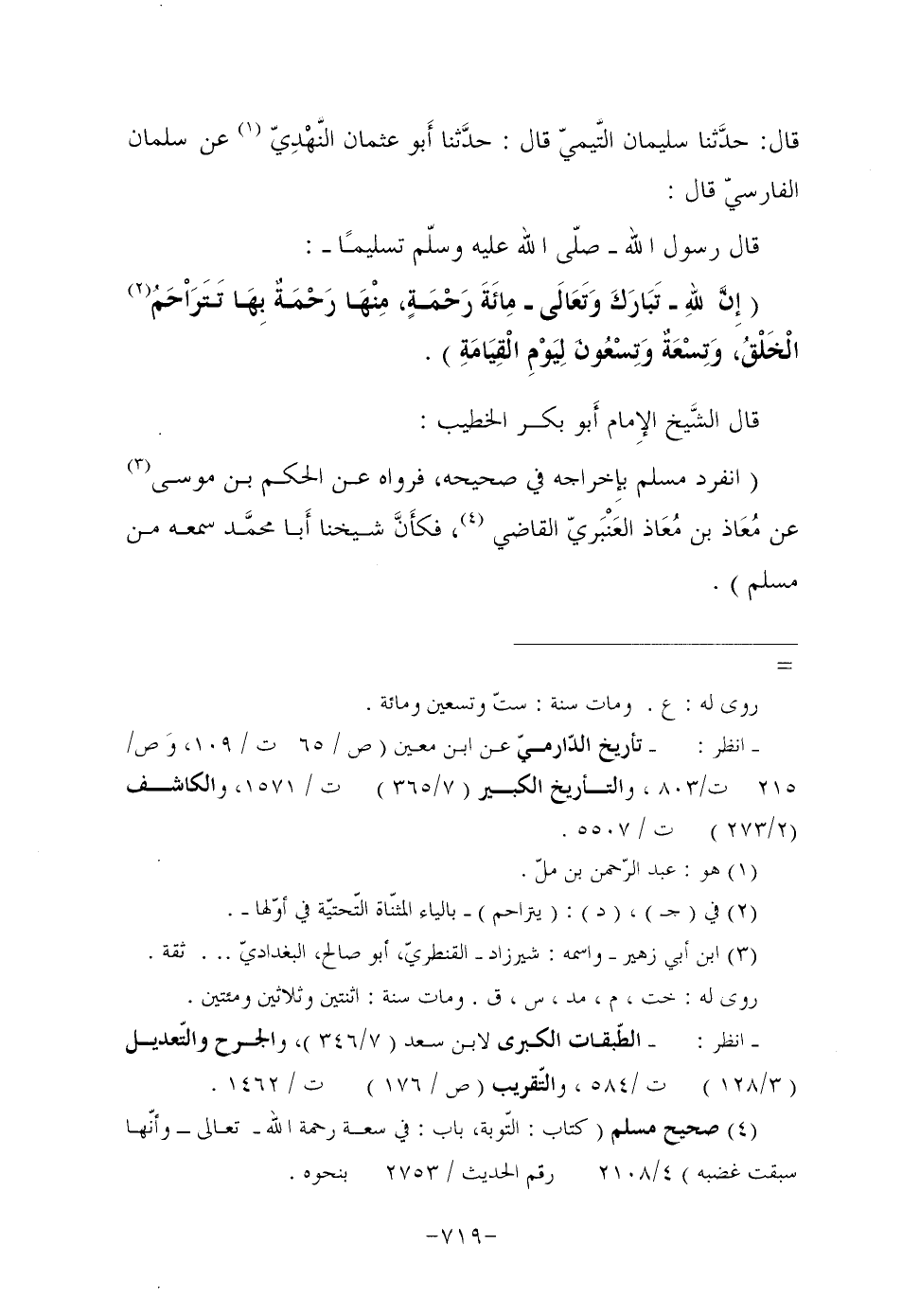 قَالَ: حدَّثنا سُلَيْمَانُ التَّيميّ قَالَ: حدَّثنا أَبو عثمان النَّهْدِيّ (¬1) عَنْ سَلْمَانَ الْفَارِسِيِّ قَالَ: قَالَ رَسُولَ اللَّهِ صَلَّى اللَّهُ عَلَيْهِ وَسَلَّمَ تَسْلِيمًا: "إِنَّ للهِ تَبَارَكَ وَتَعَالَى مِائَةَ رَحْمَةٍ، مِنْهَا رَحْمَةٌ بِهَا تَتَرَاْحَمُ (¬2) الْخَلْقُ، وَتِسْعَةٌ وَتِسْعُونَ لِيَوْمِ الْقِيَامَةِ".