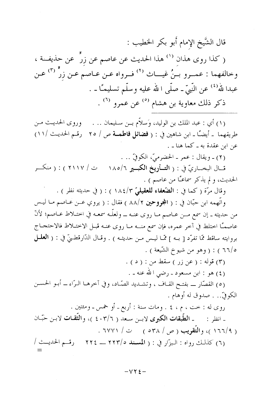 قَالَ الشَّيخ الإِمام أَبو بَكْرٍ الْخَطِيبُ: "كَذَا رَوَى هذانِ (¬1) هَذَا الْحَدِيثَ عَنْ عَاصِمٍ عَنْ زِرٍّ عَنْ حُذَيْفَةَ، وَخَالَفَهُمَا: عَمْرُو بنُ غِيَاثٍ (¬2) فَرَوَاهُ عَنْ عَاصِمٍ عَنْ زِرٍّ (¬3) عَنْ عَبْدِ اللَّهِ (¬4) عَنِ النَّبِيِّ صَلَّى اللَّهُ عَلَيْهِ وَسَلَّمَ تسليما.